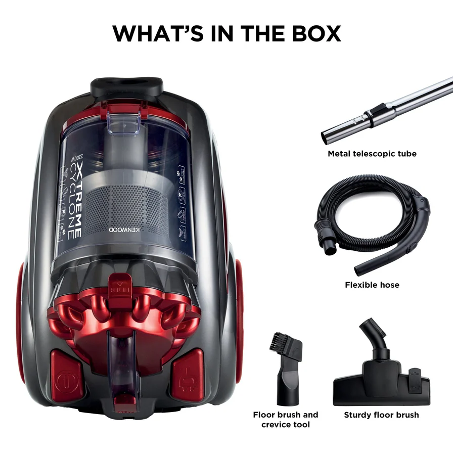 Aspirateur Kenwood Xtreme Cyclone 2200W un aspirateur puissant et pratique de Kenwood avec technologie cyclonique multiple séparant efficacement la poussière de l’air. Doté d’une puissance de 2200W et d’un réservoir de 3.5 litres, avec filtre HEPA éliminant 99.97% des particules fines jusqu’à 3 microns.Équipé d’un tube télescopique métallique réglable adapté à tous les utilisateurs, avec une brosse de sol et un suceur pour angles étroits pour un nettoyage complet. Design léger et compact facilitant le transport et les déplacements, avec réservoir vidangeable à une main sans émission de nuage de poussière. Idéal pour les soins aux animaux et le nettoyage en profondeur.